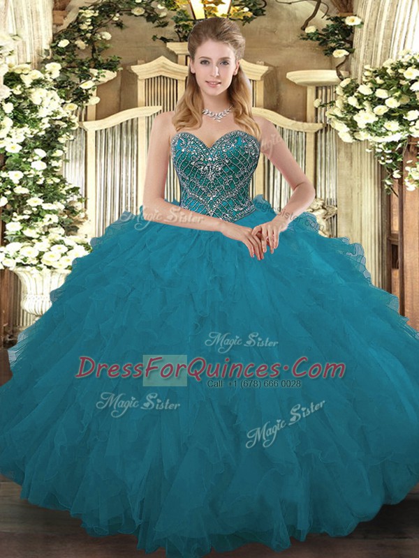 Exceptional Teal Ball Gowns Beading and Ruffled Layers Sweet 16 Dress Lace Up Tulle Sleeveless Floor Length