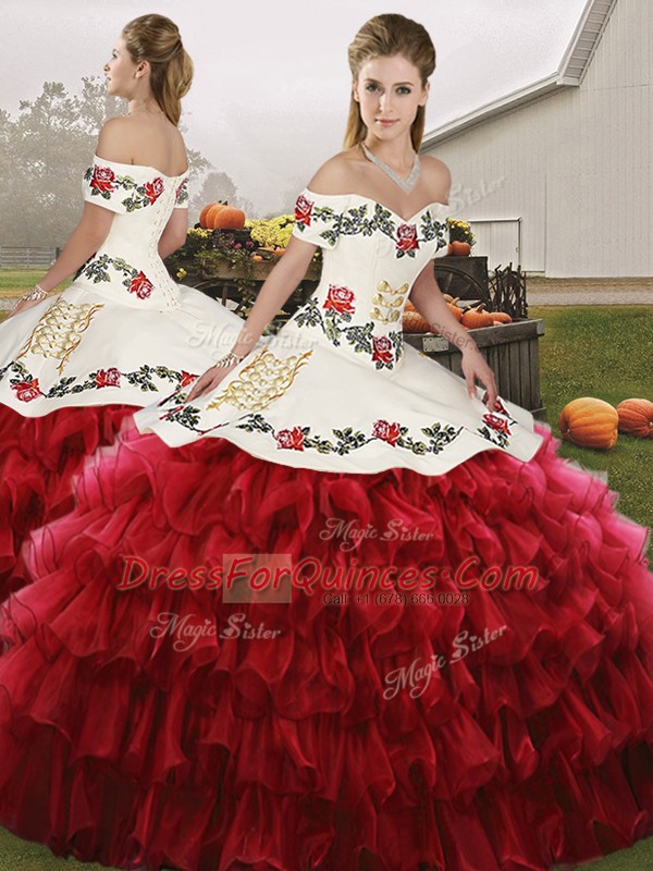 Extravagant Floor Length Wine Red Sweet 16 Dress Organza Sleeveless Embroidery and Ruffled Layers
