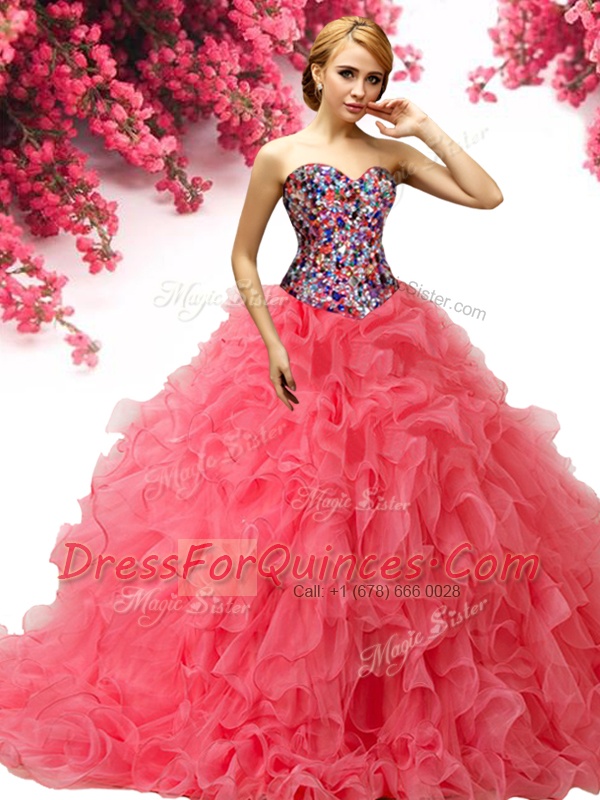 Fantastic Coral Red Sleeveless With Train Beading and Ruffles Lace Up Sweet 16 Dresses