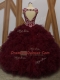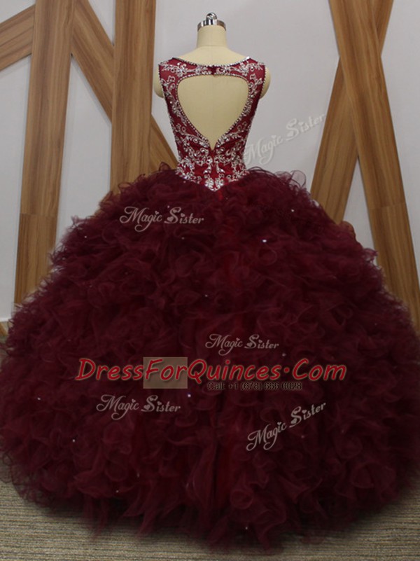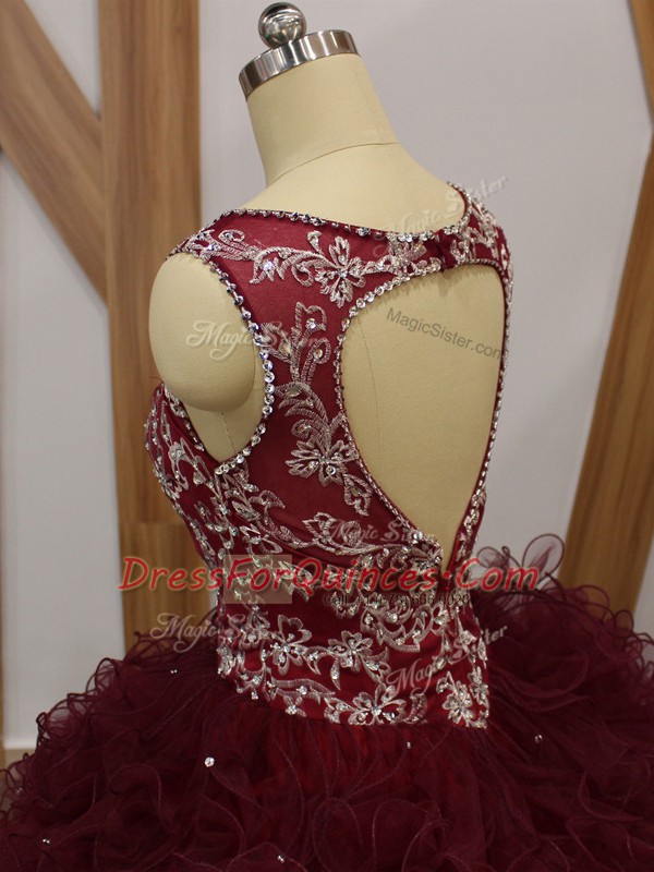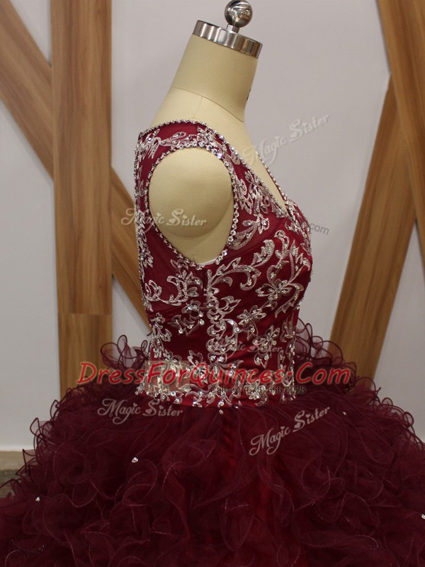 Floor Length Burgundy Quince Ball Gowns Organza Sleeveless Beading and Ruffles