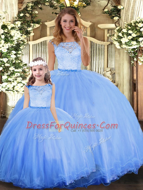 High Quality Blue Ball Gowns Scoop Sleeveless Tulle Floor Length Clasp Handle Lace Ball Gown Prom Dress