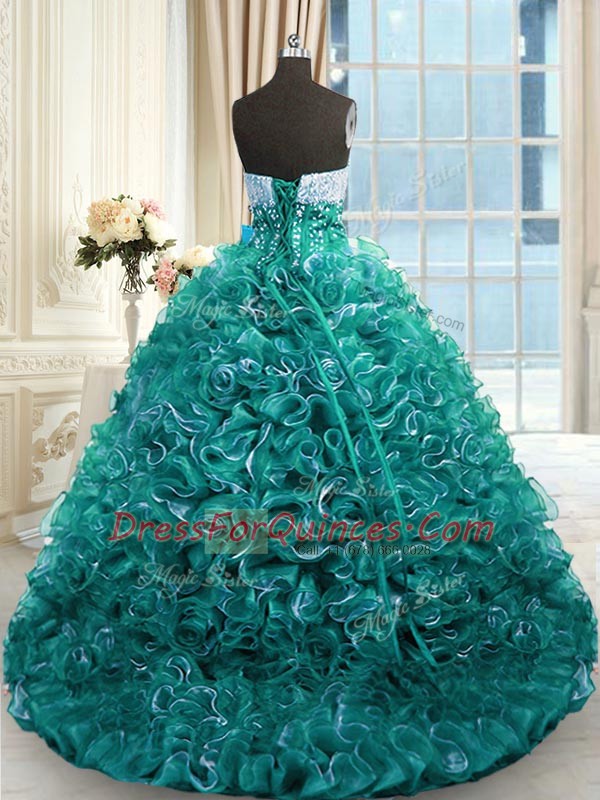 Hot Selling Brush Train Ball Gowns Sweet 16 Quinceanera Dress Turquoise Sweetheart Organza Sleeveless With Train Lace Up