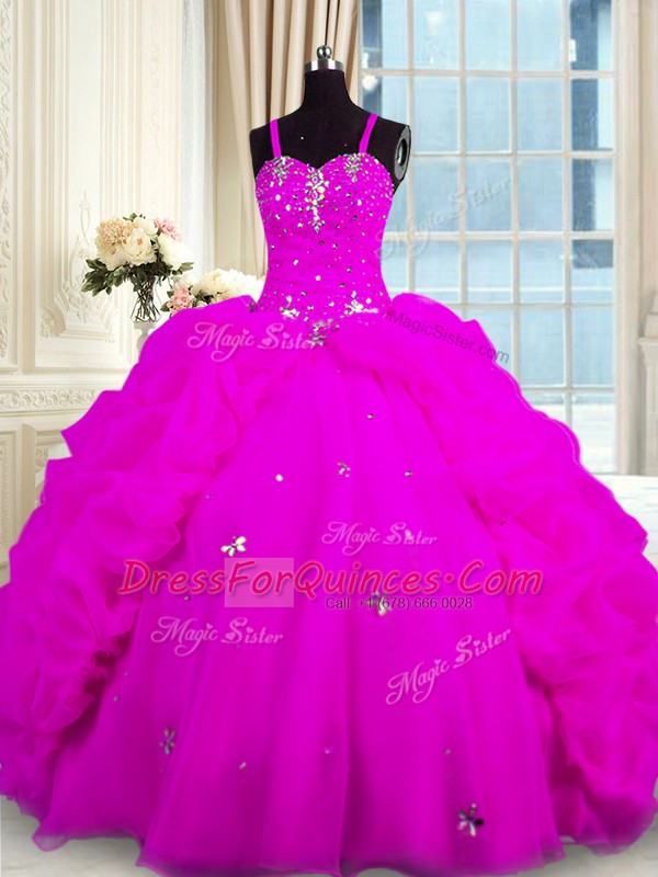 Ideal Fuchsia Ball Gowns Beading and Pick Ups Quinceanera Gown Lace Up Organza Sleeveless Floor Length