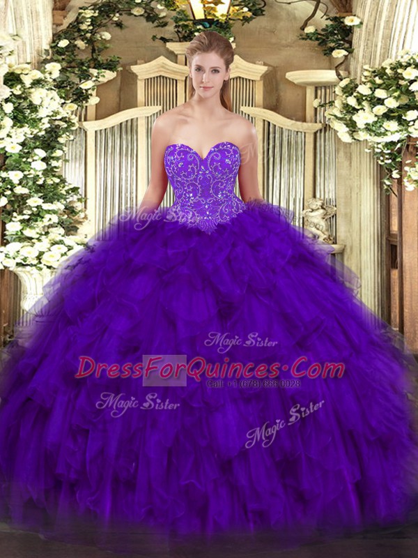 Ideal Purple Sleeveless Beading and Ruffles Floor Length Quince Ball Gowns