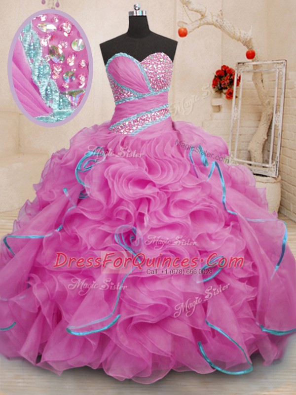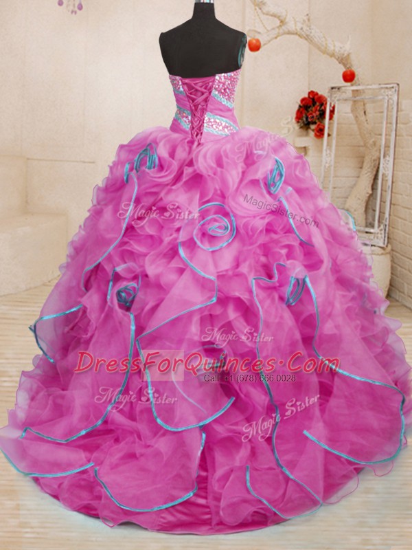Ideal Rose Pink Ball Gowns Sweetheart Sleeveless Organza With Brush Train Lace Up Beading and Ruffles Ball Gown Prom Dress