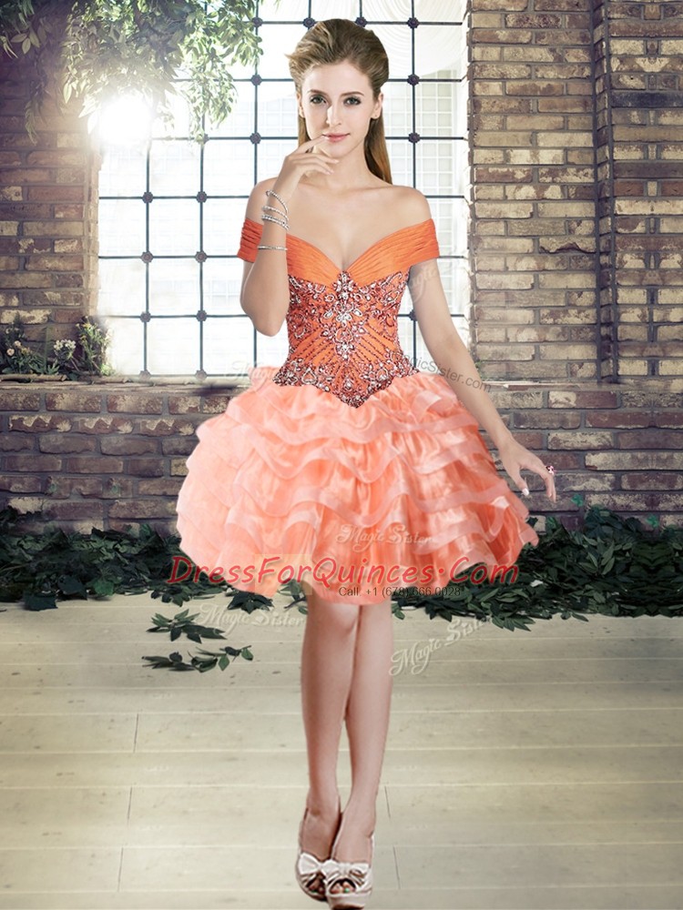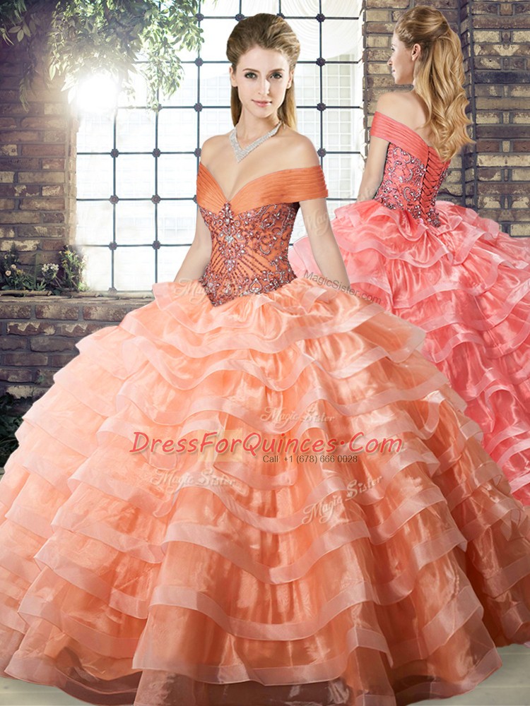 Lace Up Vestidos de Quinceanera Peach for Military Ball and Sweet 16 and Quinceanera with Beading and Ruffled Layers Brush Train