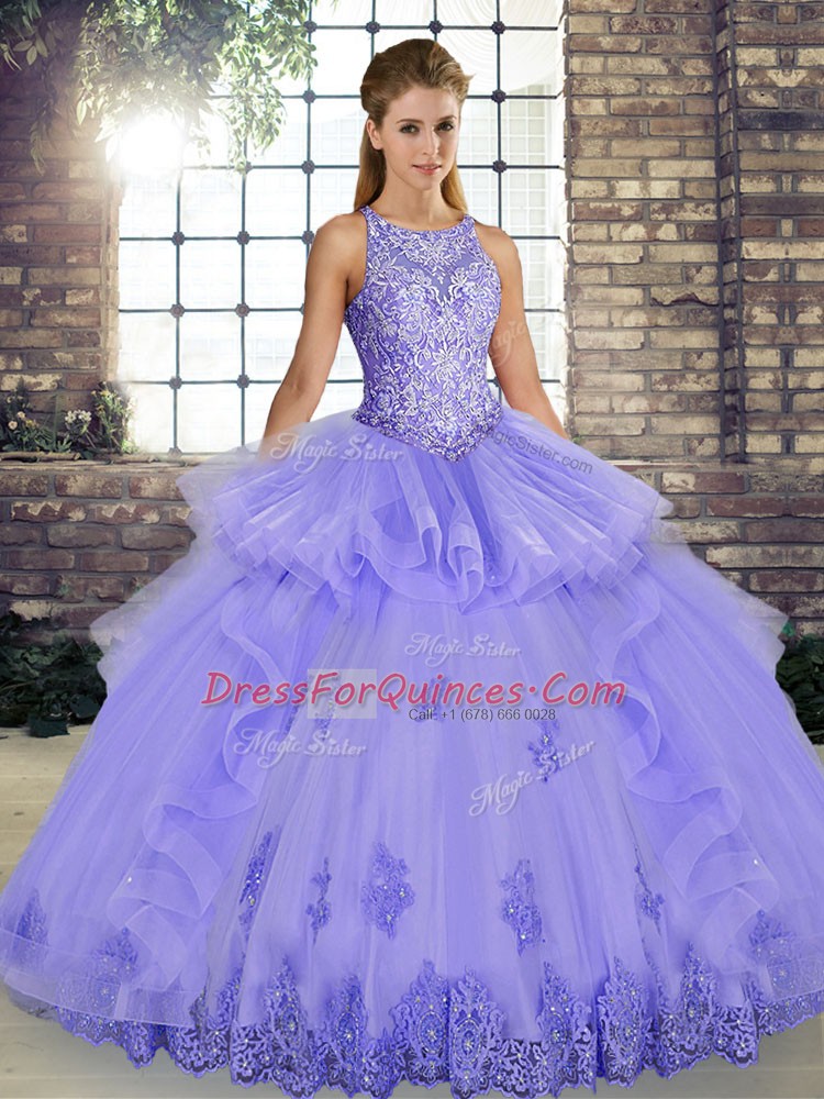 Lavender Scoop Neckline Lace and Embroidery and Ruffles Ball Gown Prom Dress Sleeveless Lace Up