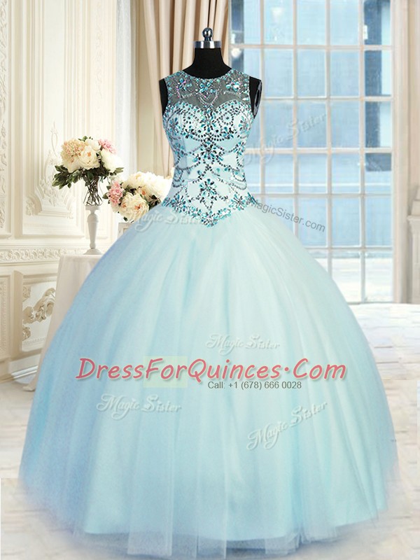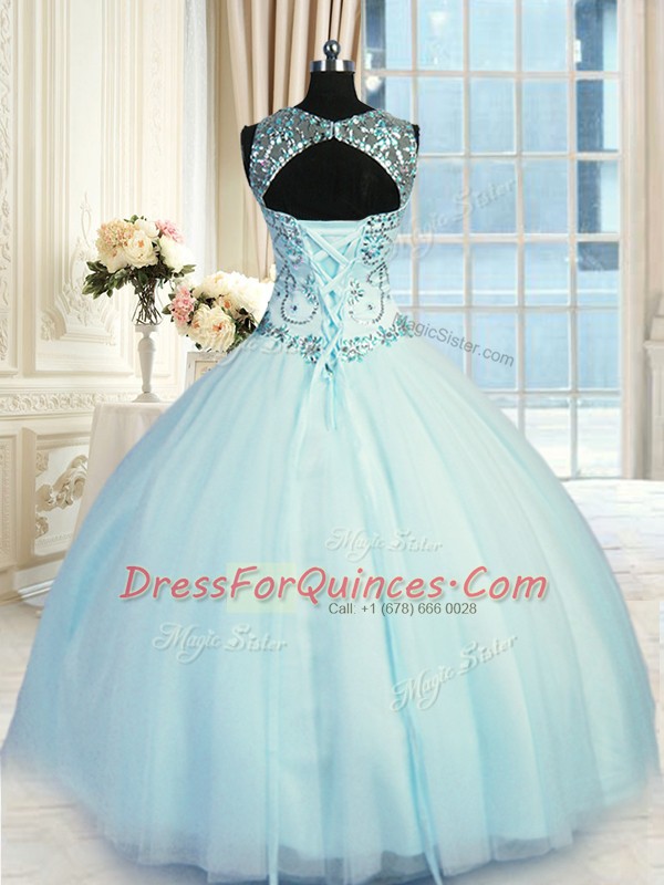 Light Blue Lace Up Scoop Beading 15 Quinceanera Dress Tulle Sleeveless