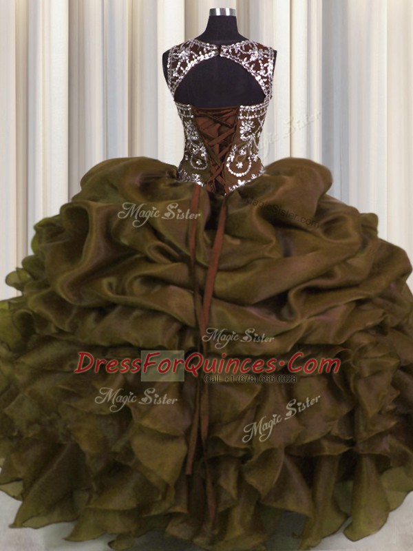 Luxury See Through Sweetheart Sleeveless Sweet 16 Dress Floor Length Beading and Pick Ups Brown Organza