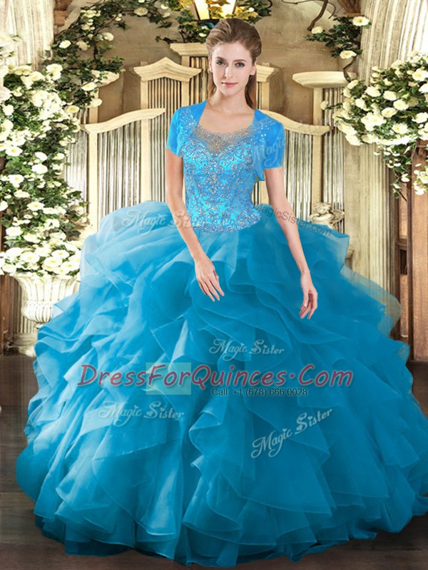 Modern Floor Length Clasp Handle Sweet 16 Dress Teal for Military Ball and Sweet 16 and Quinceanera with Beading and Ruffled Layers