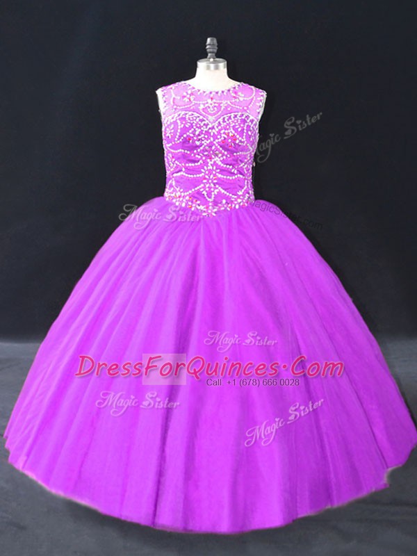 Modern Purple Ball Gowns Beading Quinceanera Dresses Lace Up Tulle Sleeveless Floor Length