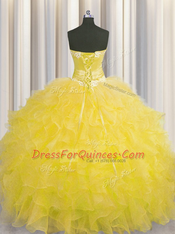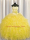 New Style Handcrafted Flower Gold Ball Gowns Beading and Ruffles and Hand Made Flower Quince Ball Gowns Lace Up Organza Sleeveless Floor Length