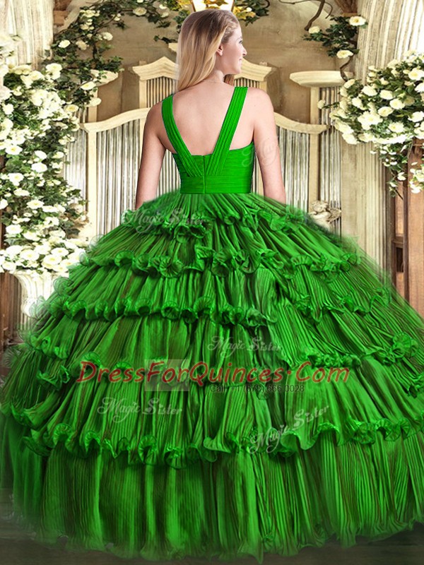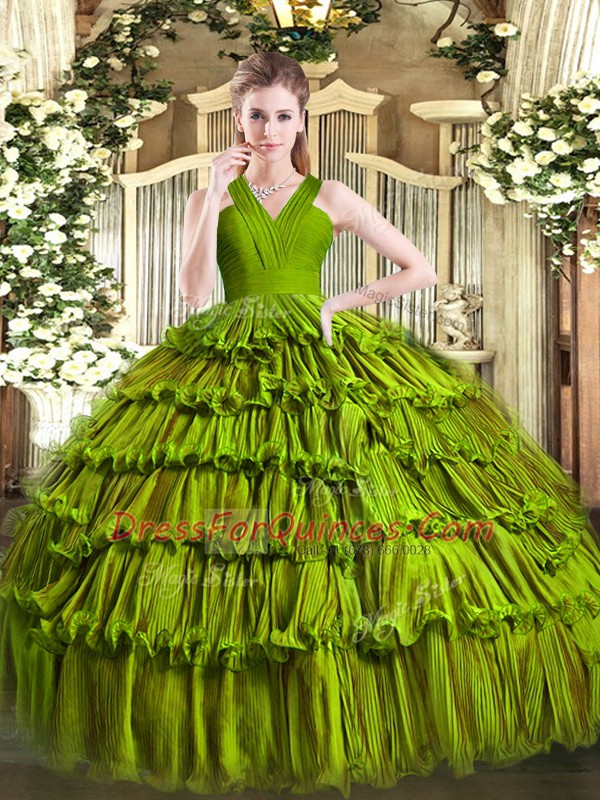 Olive Green 15th Birthday Dress Military Ball and Sweet 16 and Quinceanera with Ruffled Layers V-neck Sleeveless Zipper