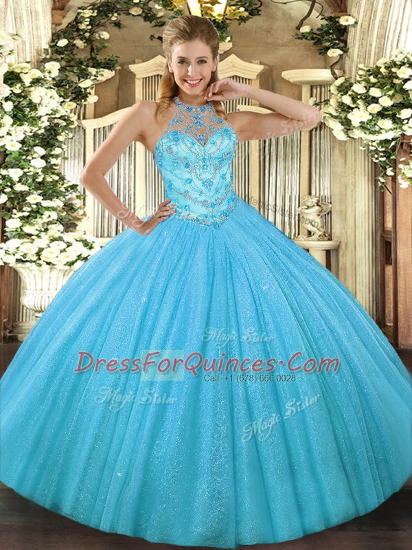 On Sale Aqua Blue Halter Top Neckline Beading and Embroidery Quinceanera Gown Sleeveless Lace Up