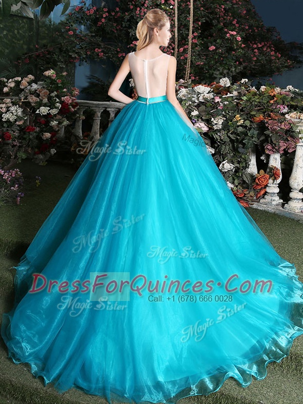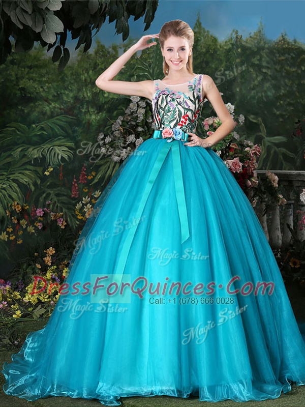 Popular Scoop Sleeveless Organza Brush Train Zipper Sweet 16 Dresses in Teal with Appliques and Belt