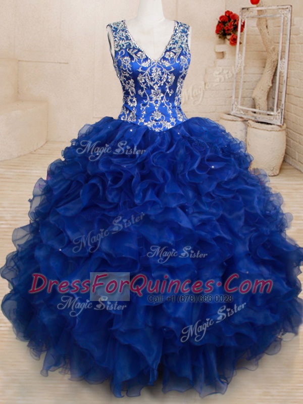 Romantic Royal Blue Backless Quince Ball Gowns Beading and Embroidery and Ruffles Sleeveless Floor Length