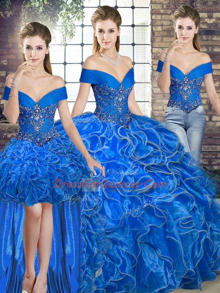 Royal Blue Organza Lace Up 15th Birthday Dress Sleeveless Floor Length Beading and Ruffles