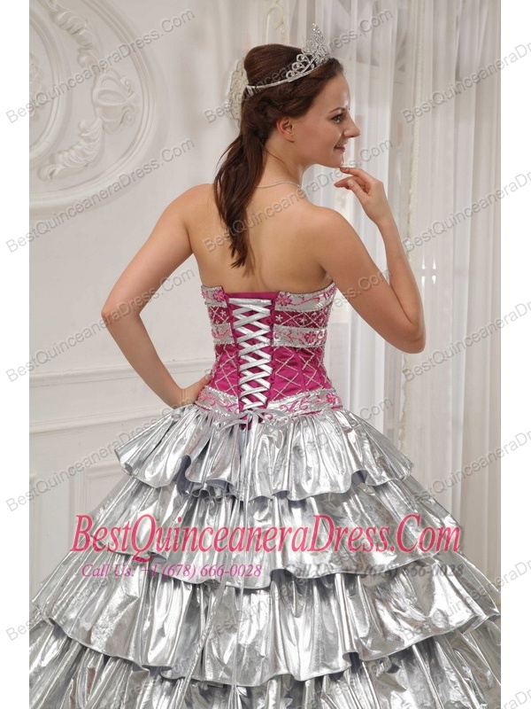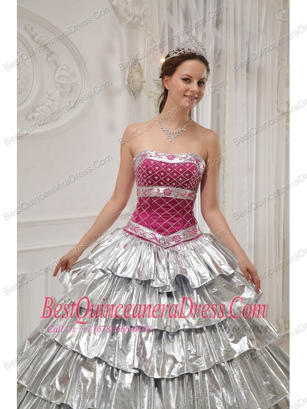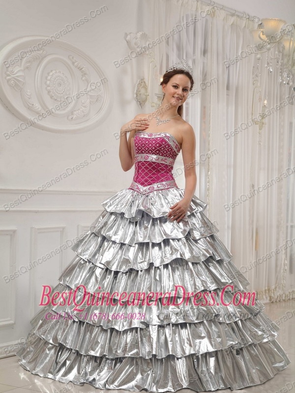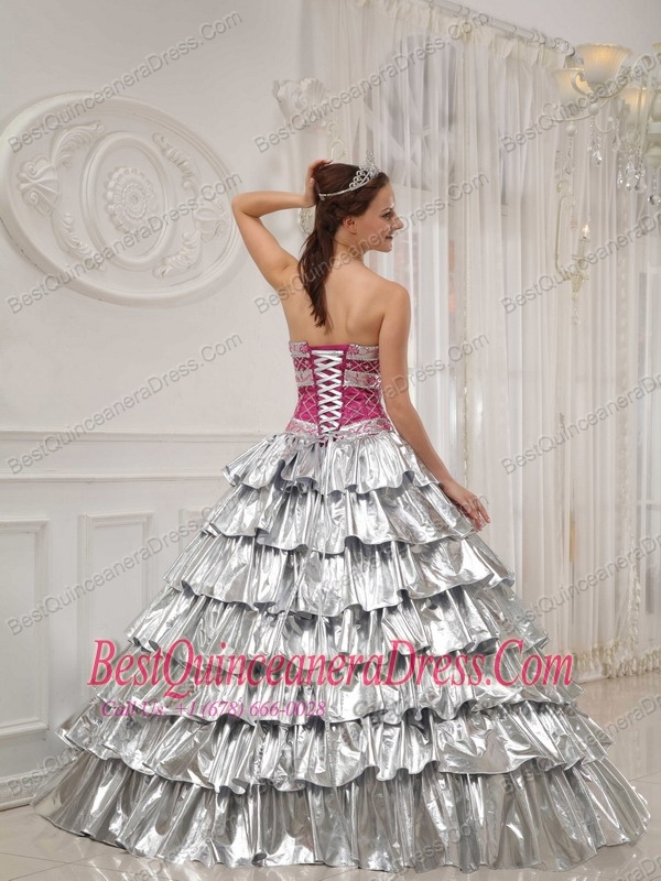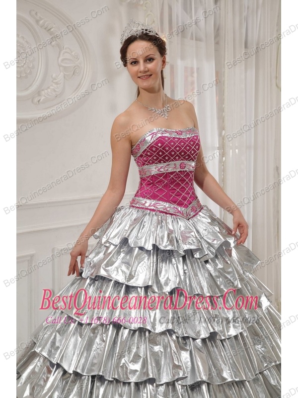 Silver and Fuchisa A-line / Princess Strapless Floor-length Taffeta Beading Quinceanera Dress