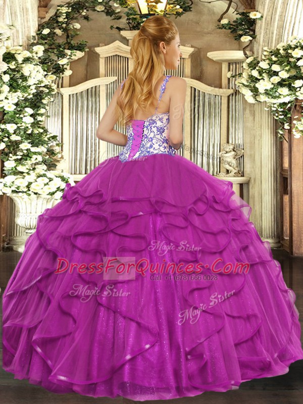 Simple Hot Pink Sleeveless Floor Length Beading and Appliques and Ruffles Lace Up Ball Gown Prom Dress