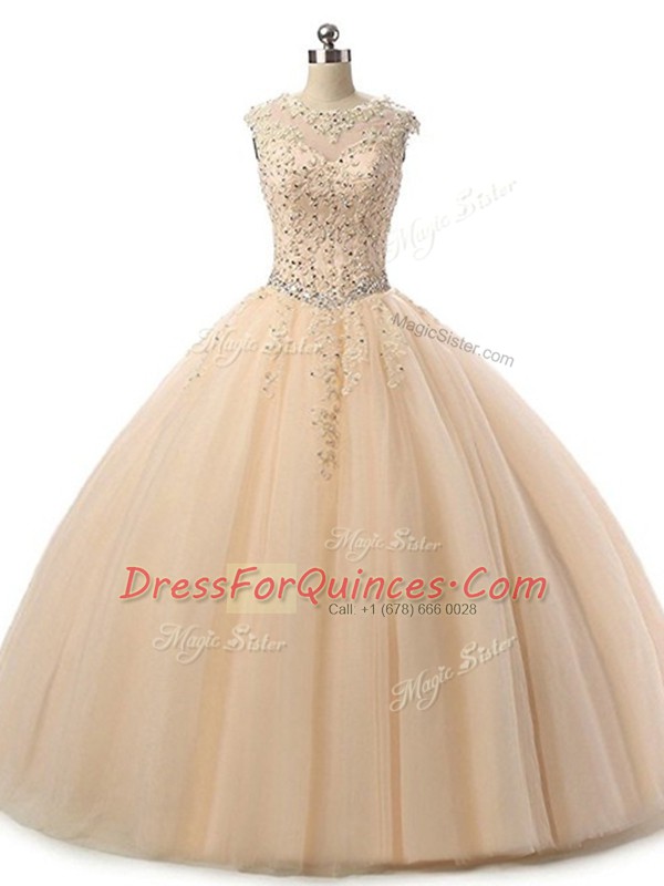 Stunning Champagne Ball Gowns Tulle Scoop Sleeveless Beading and Lace Floor Length Lace Up Quinceanera Gowns
