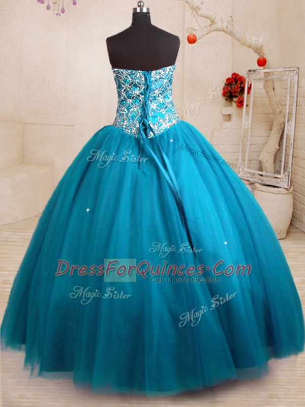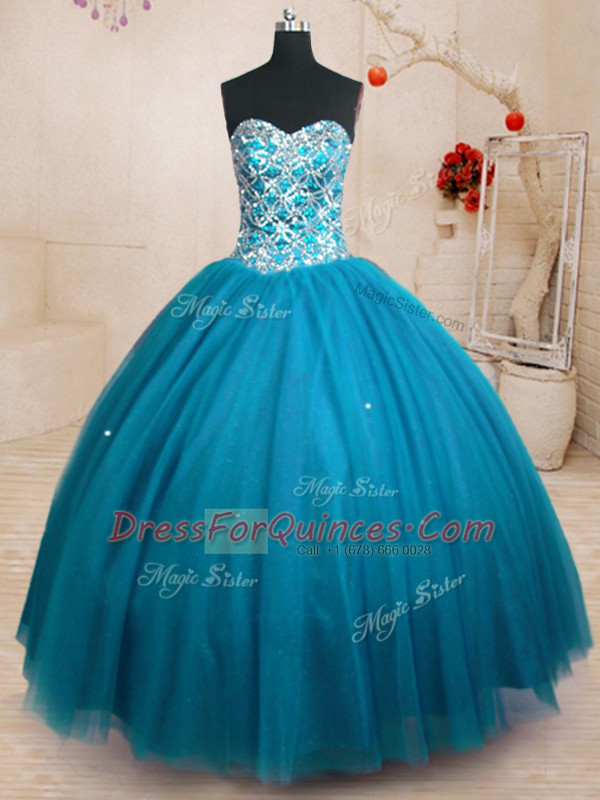 Sumptuous Floor Length Teal Ball Gown Prom Dress Tulle Sleeveless Beading