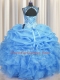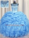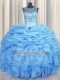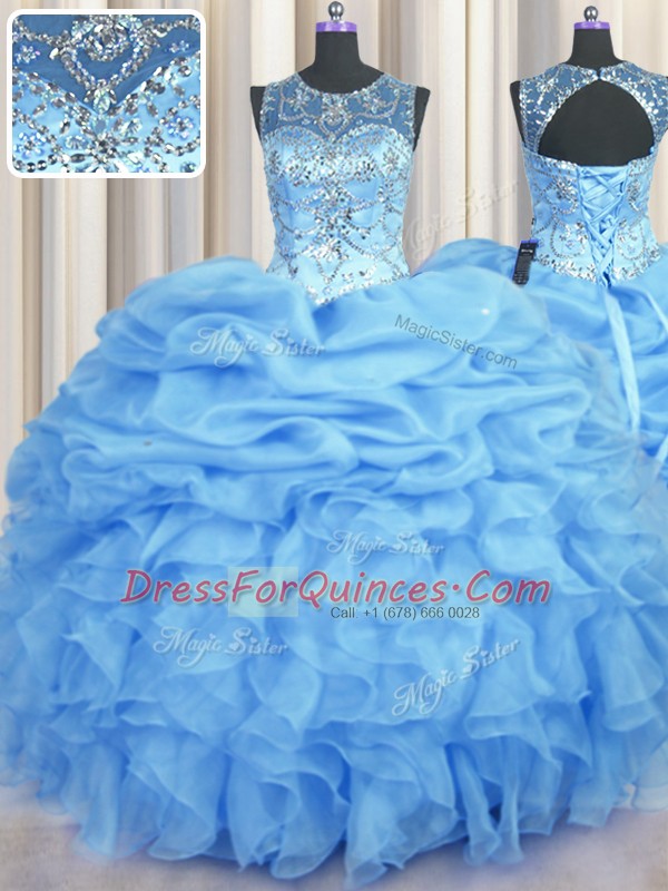 Sumptuous See Through Light Blue Organza Lace Up 15 Quinceanera Dress Sleeveless Floor Length Beading and Ruffles and Pick Ups