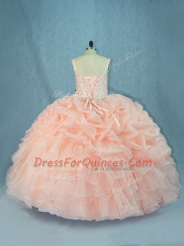 Sweet Peach Ball Gowns Straps Sleeveless Organza Lace Up Beading Quinceanera Gown