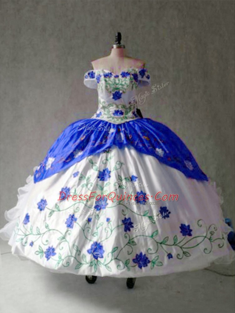 Traditional Blue And White Off The Shoulder Lace Up Embroidery and Ruffles Vestidos de Quinceanera Cap Sleeves