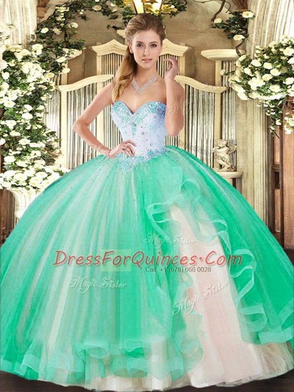 Vintage Turquoise Ball Gowns Beading and Ruffles Sweet 16 Dress Lace Up Tulle Sleeveless Floor Length
