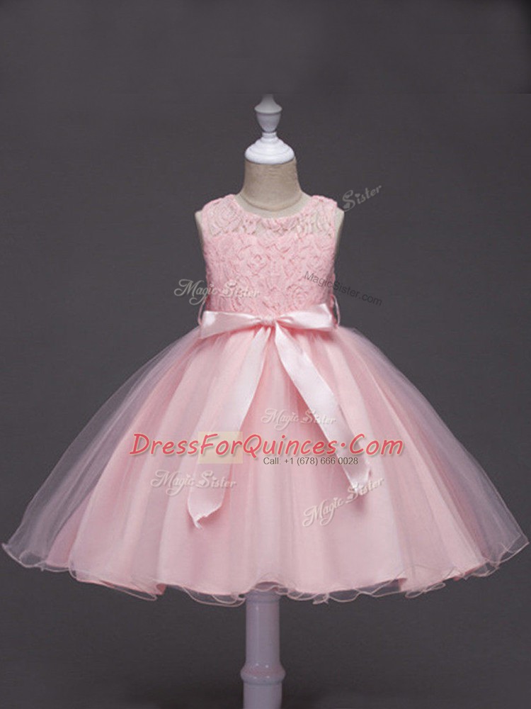 Attractive Scoop Sleeveless Little Girls Pageant Dress Knee Length Lace and Belt Baby Pink Tulle