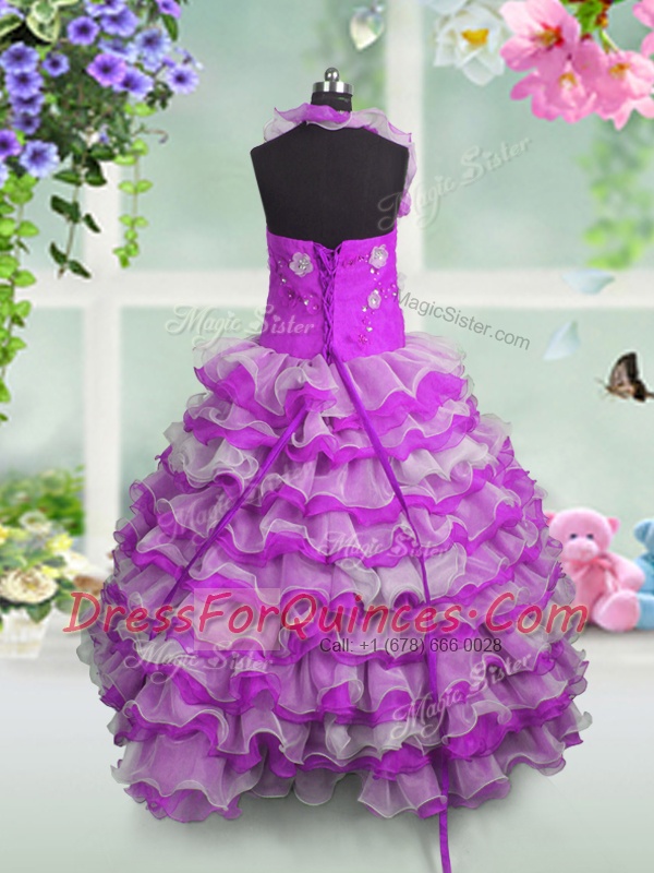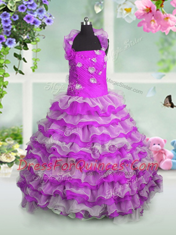 Best Selling Beading and Appliques and Ruffled Layers Toddler Flower Girl Dress Fuchsia Lace Up Sleeveless Floor Length