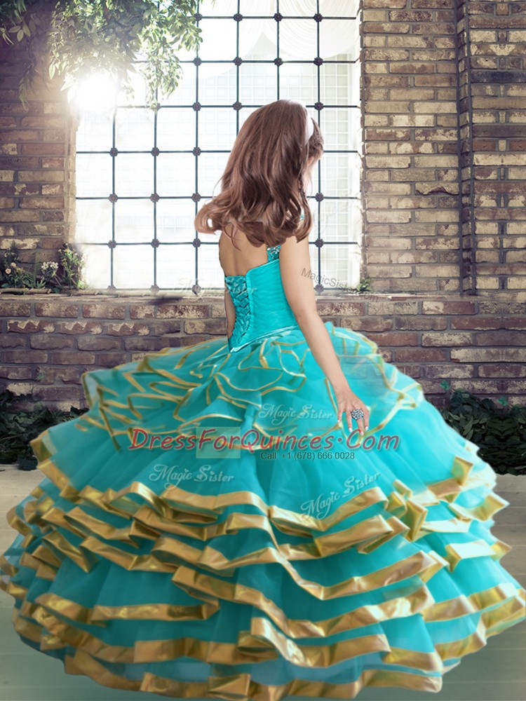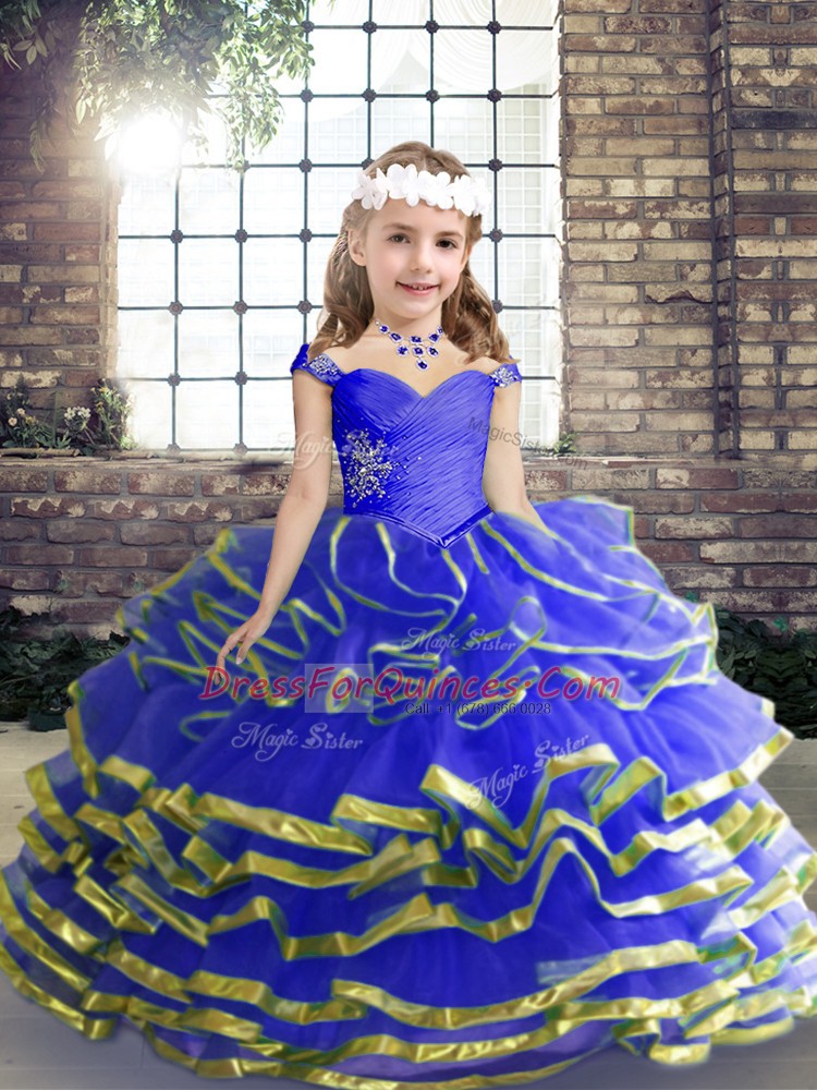 Blue Lace Up Child Pageant Dress Beading and Ruching Sleeveless Floor Length