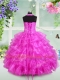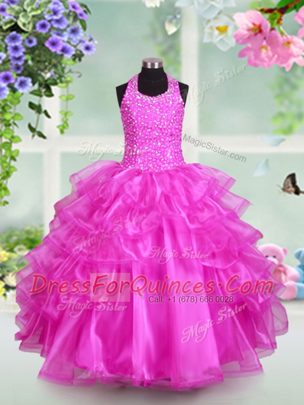 Charming Halter Top Fuchsia Sleeveless Floor Length Beading and Ruffled Layers Lace Up Flower Girl Dress