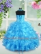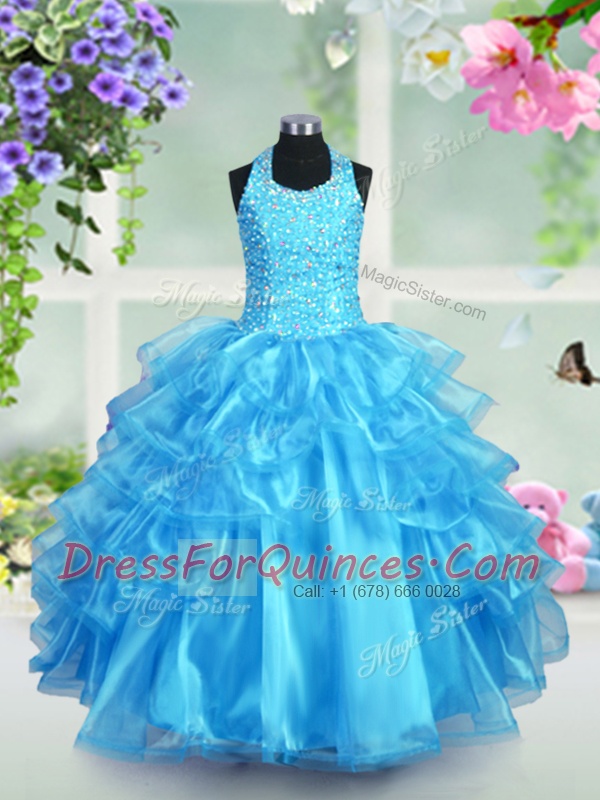 Customized Halter Top Beading and Ruffled Layers Flower Girl Dresses Aqua Blue Lace Up Sleeveless Floor Length