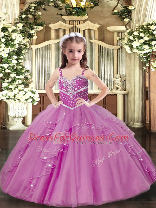 Customized Lilac Straps Neckline Beading and Ruffles Little Girls Pageant Gowns Sleeveless Lace Up