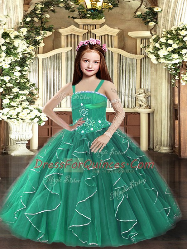 Dark Green Ball Gowns Tulle Straps Sleeveless Beading and Ruffles Floor Length Lace Up Little Girls Pageant Gowns