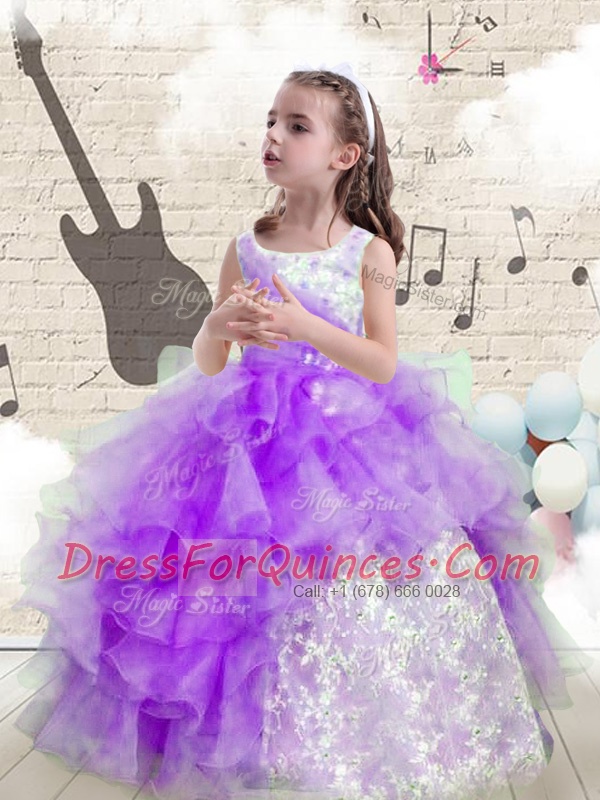 Eggplant Purple Ball Gowns Scoop Sleeveless Organza Floor Length Lace Up Beading and Ruffled Layers Flower Girl Dresses