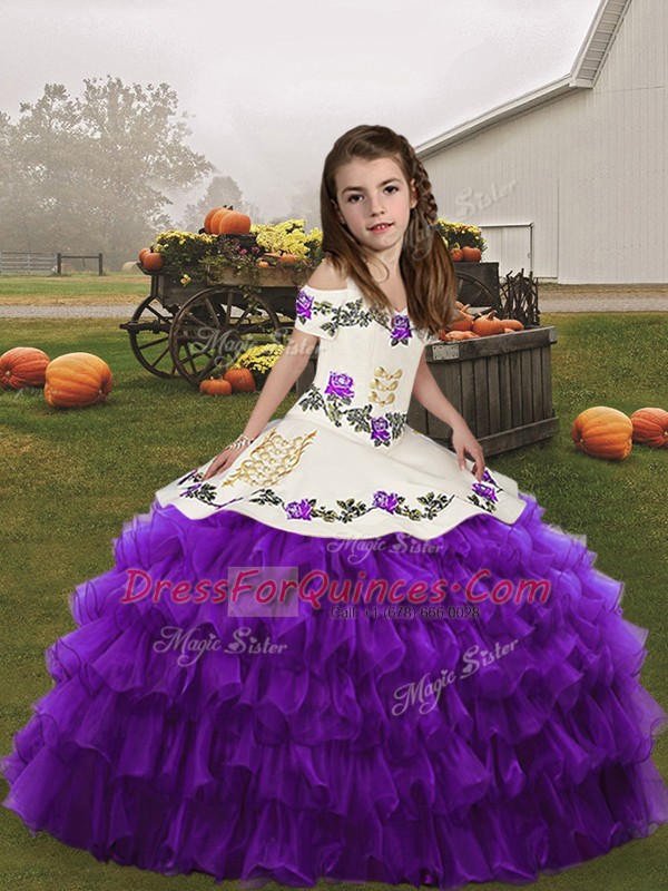 Eggplant Purple Straps Lace Up Embroidery and Ruffled Layers Kids Formal Wear Sleeveless