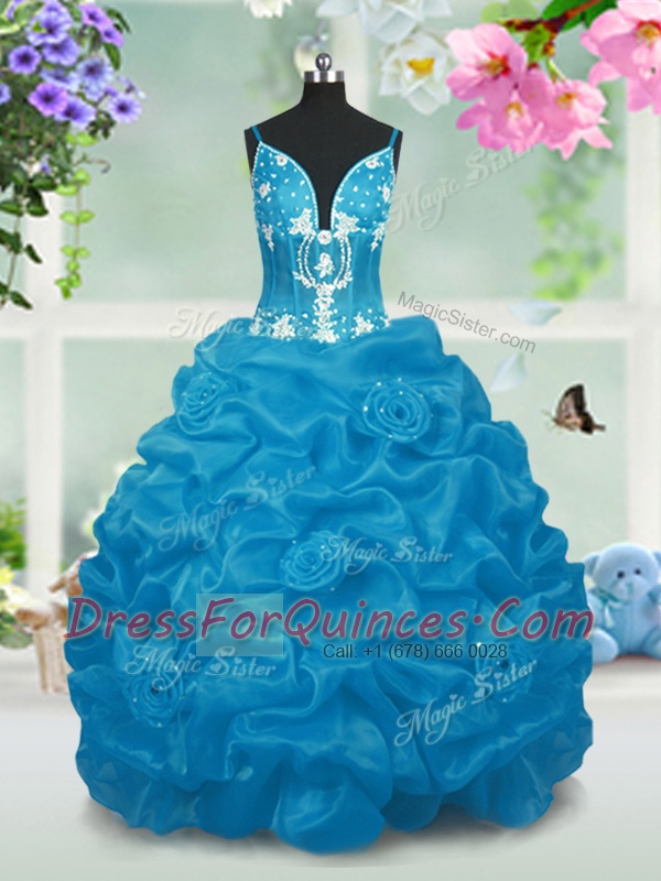 Fancy Baby Blue Ball Gowns V-neck Sleeveless Taffeta Floor Length Lace Up Beading and Pick Ups Flower Girl Dresses