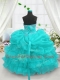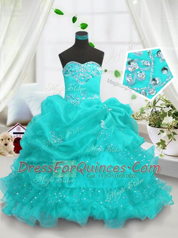 Flirting Aqua Blue Organza Lace Up Sweetheart Sleeveless Floor Length Flower Girl Dress Beading and Ruffled Layers and Pick Ups