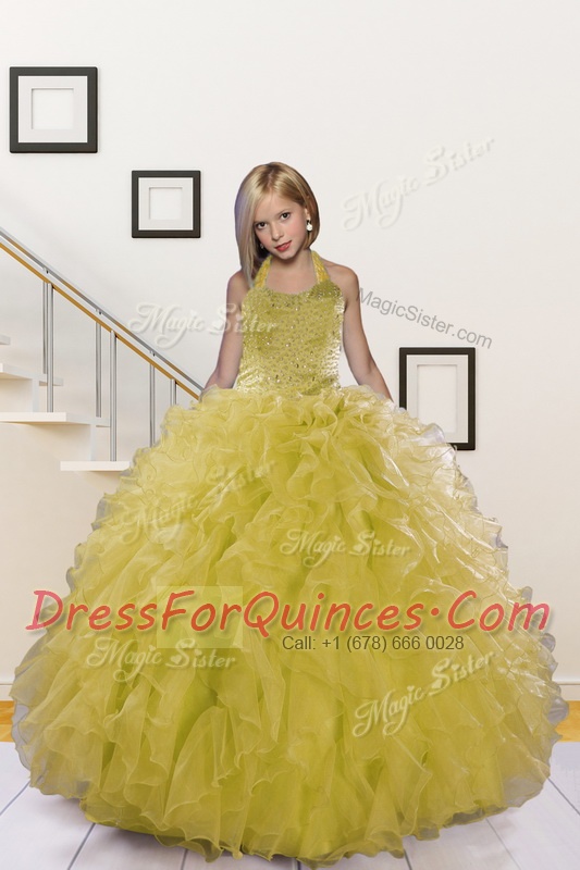 Floor Length Light Yellow Flower Girl Dresses Halter Top Sleeveless Lace Up