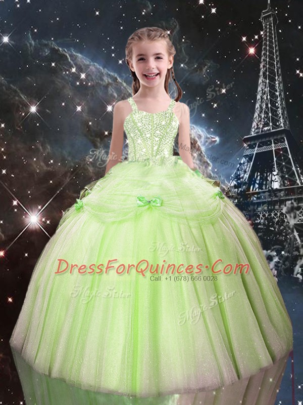 Floor Length Yellow Green Little Girls Pageant Dress Tulle Sleeveless Beading