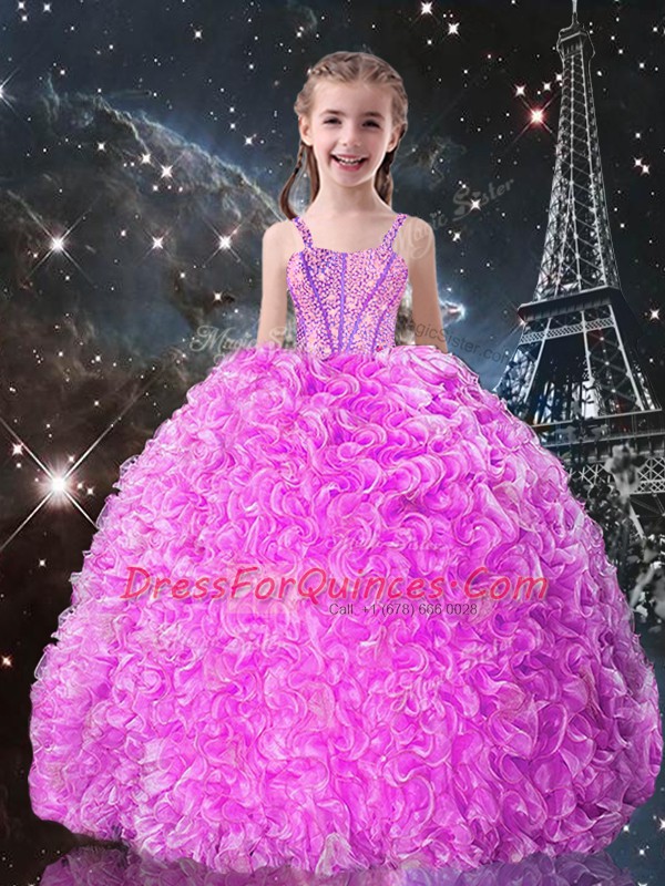 Fuchsia Straps Neckline Beading and Ruffles Girls Pageant Dresses Sleeveless Lace Up