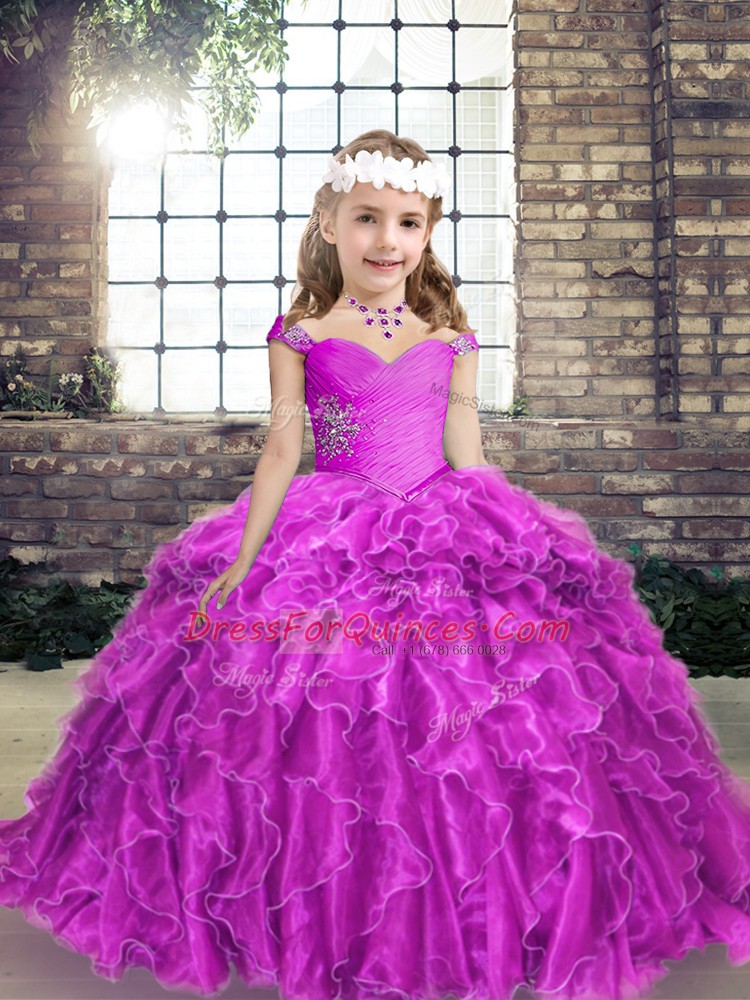 Fuchsia Straps Neckline Beading and Ruffles Little Girls Pageant Gowns Sleeveless Lace Up