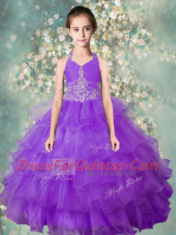 Glamorous Halter Top Sleeveless Toddler Flower Girl Dress Floor Length Beading and Ruffled Layers Lavender Organza