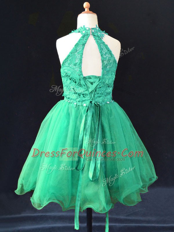 Green Organza Lace Up Halter Top Sleeveless Mini Length Kids Formal Wear Beading and Lace