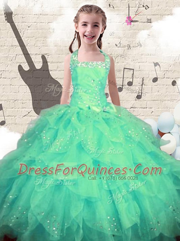 Halter Top Beading and Ruffles Toddler Flower Girl Dress Turquoise Lace Up Sleeveless Floor Length