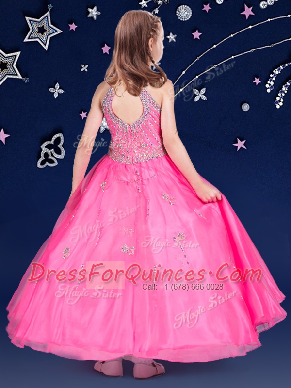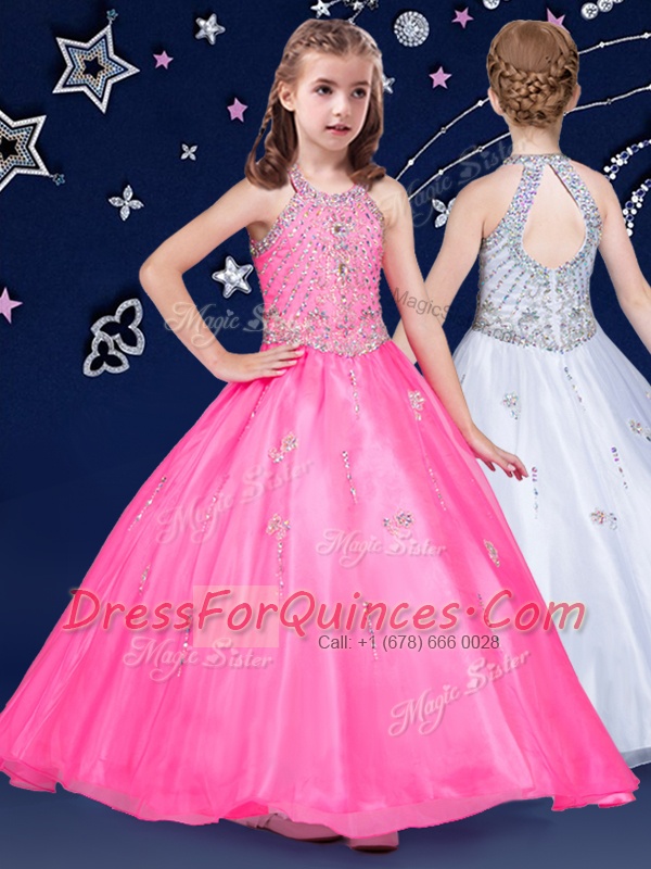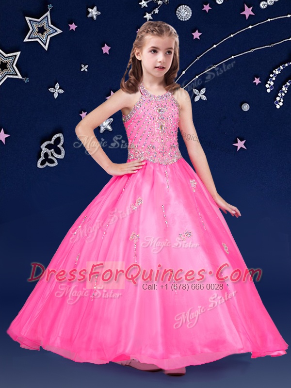 Halter Top Hot Pink Ball Gowns Beading Flower Girl Dresses for Less Zipper Organza Sleeveless Floor Length