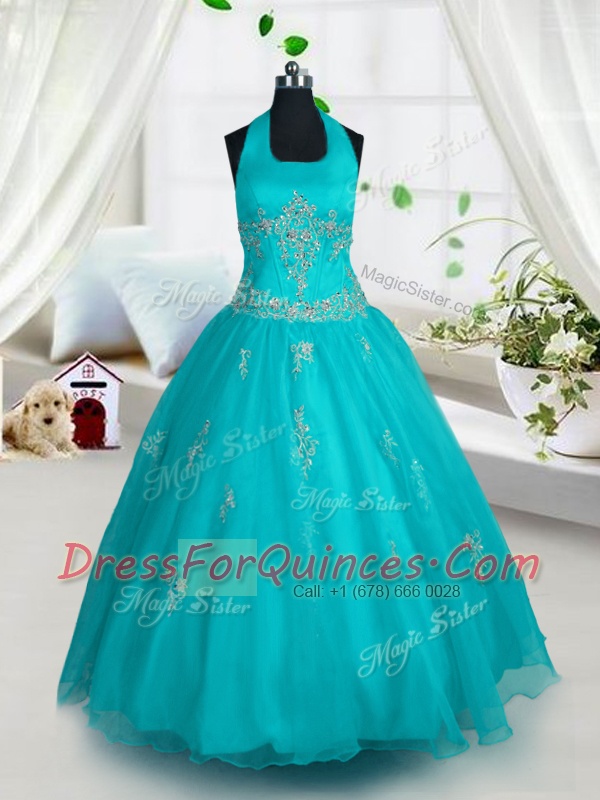 Halter Top Sleeveless Lace Up Floor Length Appliques Toddler Flower Girl Dress
