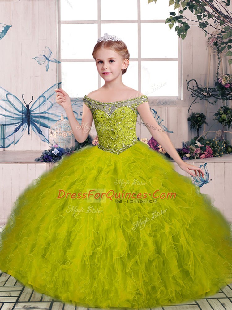 High Quality Beading and Ruffles Child Pageant Dress Olive Green Lace Up Sleeveless Floor Length